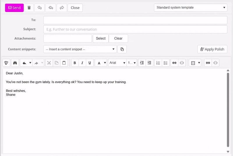 The Polish function is available in all message creation functions in GymOS, including the message centre, broadcasts, nurturing, campaigns and triggers. It has been designed to work with both plain text and immersive emails, preserving formatting and delivering impact.